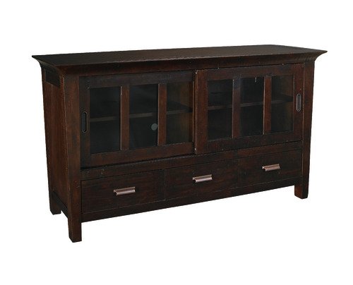 This richly crafted and beautifully designed entertainment console displays your flatscreen proudly. With two sliding glass doors and an adjustable shelf behind each one, it is versatile in its ability to house valuables, books or cd's. Three drawers equipped with hammered copper patina finished hardware also provide ample storage.
